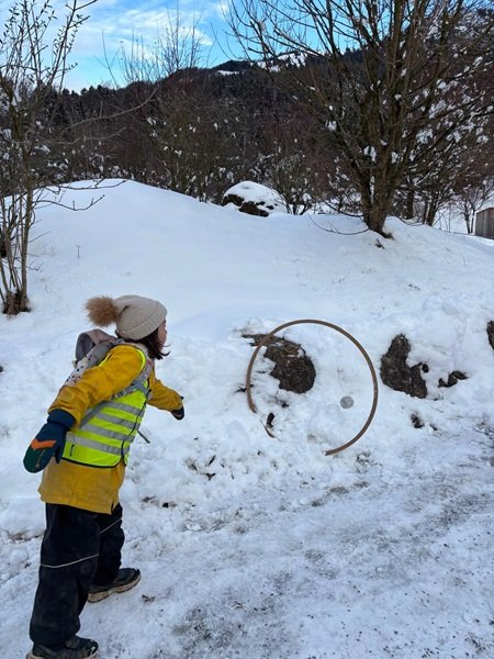 Bei gemeinsamen Klassenaktivitäten wurde das Thema weiter vertieft. Formen und Schneemänner wurden gespiegelt, glitzernde Schneekugeln gebastelt und Schneebälle gezielt in bestimmte Ziele geworfen. Auch die Sprache kam nicht zu kurz: Lustige Reimwörter sorgten für viele Lacher und bereicherten den Kindergartenalltag.