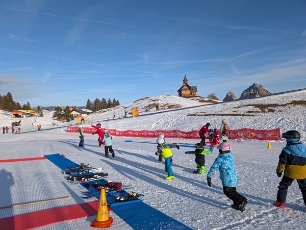 Ein Grossteil der Kinder war mit Ski oder Snowboard unterwegs. Acht der jüngsten Kinder verbrachten den Tag mit Spielen im Schnee und gemütlichen Spaziergängen. Die weiter fortgeschrittenen Fahrerinnen und Fahrer erkundeten gemeinsam mit ihren Begleitpersonen der Schule die Skilifte und Pisten des Gebiets.