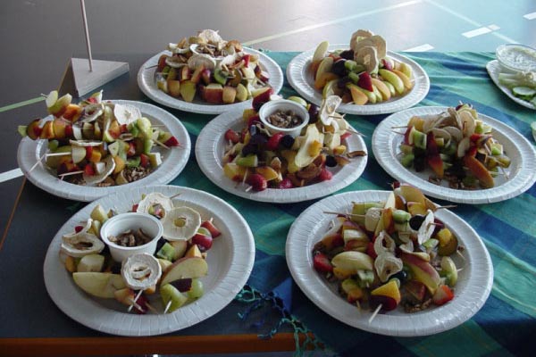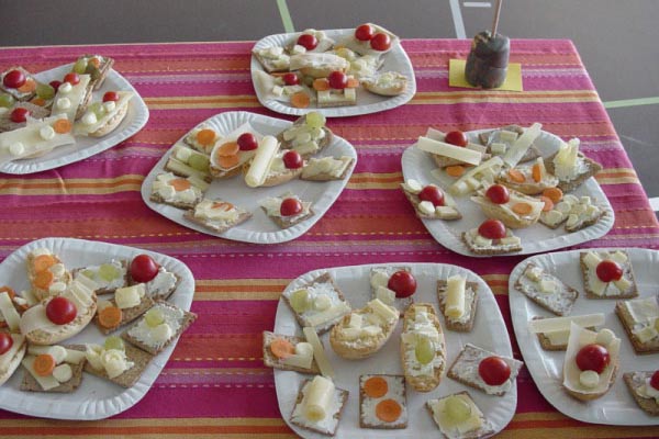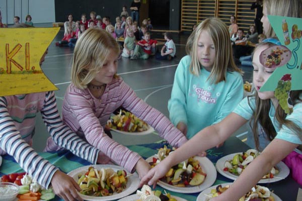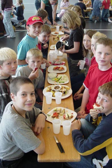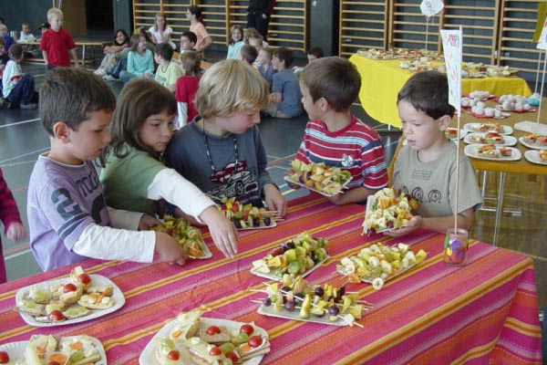 Dem wollte die Lehrerschaft der Primarschule Lauerz etwas entgegensteuern. In den letzten Wochen wurden in allen Klassen und im Kindergarten die gesunde Ernährung und die Zahnprophylaxe stufengemäss thematisiert. Abschluss diese Projektes bildete eine verlängerte Znüni-Pause. Nachdem der Lauerzer Znünisong aus mehr als 100 Kehlen verklungen war, konnten sich die Schüler an einem riesiegen Znüni-Buffet gütlich tun. Jede Klasse hatte gesunde Znüni-Spezialitäten vorbereitet und liess nun auch die anderen Klassen daran teilhaben. Früchtespiessli, Gemüsedip, Schlangenbrot und Kososkugeln standen hoch im Kurs. Schokoladen, Gummibärchen und Pommes waren nicht eingeladen worden. Geschmeckt hats trotzdem.