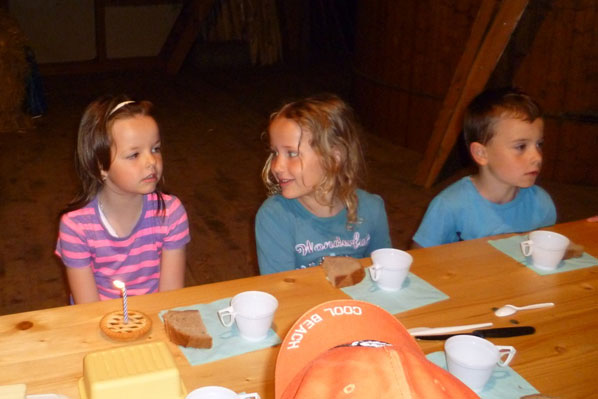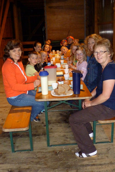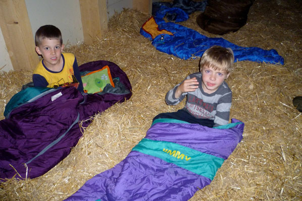 Langsam kam Müdigkeit auf, doch keiner wollte den Anfang mit Zubettgehen machen. Also entschieden wir uns, alle schon in den Schlafsack zu liegen. Es dauerte nicht lange, da kehrte Ruhe ein und die Kinder schliefen tief und fest bis zum nächsten Morgen. Nach dem Morgenessen verabschiedeten wir uns von Familie Schilter und es waren sich alle einig: Das Übernachten im Stroh hat allen gefallen und am liebsten würden sie es bald noch einmal machen!