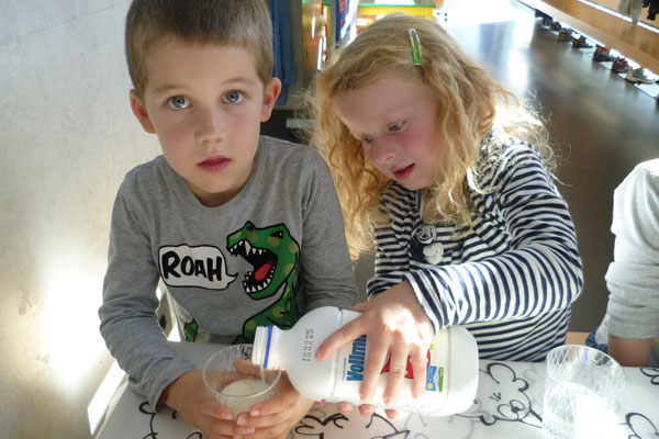 Die Versuche wurden sorgfältig betrachtet und es wurde gemeinsam nach Erklärungen gesucht. Denn es sollte nicht beim "Hokuspokus-Effekt" bleiben - schliesslich heisst es ja Forschernachmittag. So kamen mit etwas Hilfe verschiedene Thesen auf: Das Wasser ist schwerer als Öl. Essig teilt die Milch. Luft erzeugt mit Spülmittel und Wasser Schaum, also ist der Schaum nichts anderes als ganz viele kleine Seifenblasen auf einem Haufen.