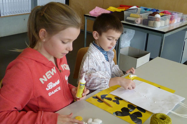 An zwei Nachmittagen trafen sich die „Kleinkindergärtler“ und die Mädchen der 5. Klasse im Handarbeitszimmer. Je ein Kindergarten- und ein 5. Klasskind bekamen eine leere Papiertasche. Zusammen sollten sie aus verschiedenen Materialien die Tasche gestalten. Wichtig war, dass beide zur Arbeit etwas beitragen konnten. Teamwork war also angesagt, was auch sehr gut klappte!