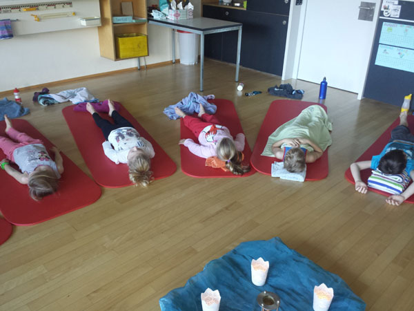 Wir starteten mit einer Entspannungsübung, gefolgt von Yogapositionen, die das Gleichgewicht teilweise auf eine harte Probe stellten. Im nächsten Teil durfte das eine Kind zuerst eine geführte Massage geniessen, während das andere das liegende Kind mit Elementen der traditionellen Thaimassage massierte.