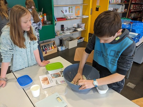 Gemeinsam mit den Kindern stellte Solène Früchte und Gemüse aus Marzipan her und repetierte dabei das aktuelle Vokabular zu den Lebensmitteln, Zahlen und Farben. Mit viel Geduld erklärte sie auf Französisch Schritt für Schritt, wie man Marzipan herstellt, mit welchen Farben grün, orange und violett gemischt und wie die Lebensmittel gestaltet werden können.