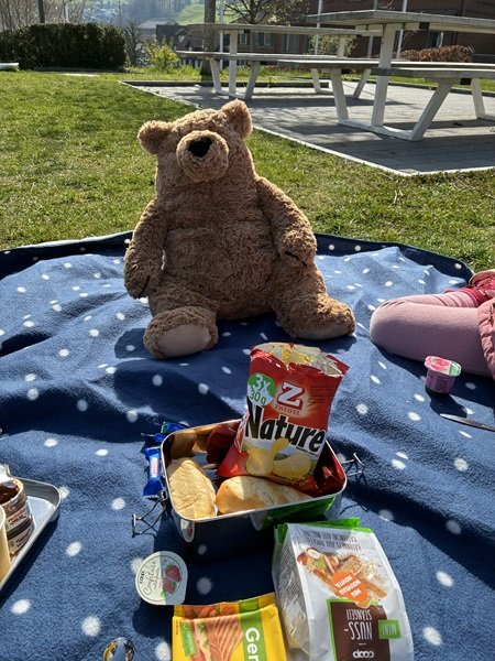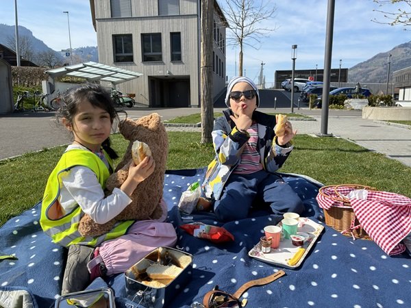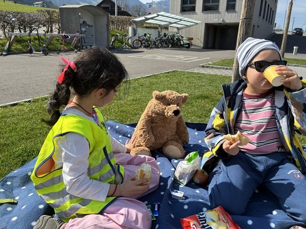 Wir lernen die Wörter spielerisch beim Auspacken des Korbes. Anschliessend geht es an’s Schmausen. Jedes Kind darf sein Wunschbrot bestellen: «Ich möchte gerne eine Käse-Schinken-Sandwich haben, bitte! «Ich hätte gerne ein Nutella-Brot.» Natürlich gibt’s dann auch noch etwas zum Trinken: Wie wäre es mit Apfel- oder Orangensaft?