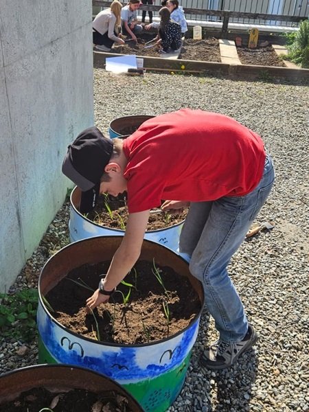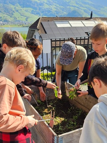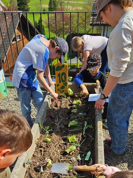 Für ein ertragreiches Jahr durften alle Kinder als erstes Schafwolldünger in ihre Beete einarbeiten. Es wurden unter anderem Salate, Fenchel, Kohlrabi und Randen gepflanzt sowie Rüebli, Kresse und Radieschen gesät. Auch zwei Beete voller Kartoffeln sind in den Startlöchern.