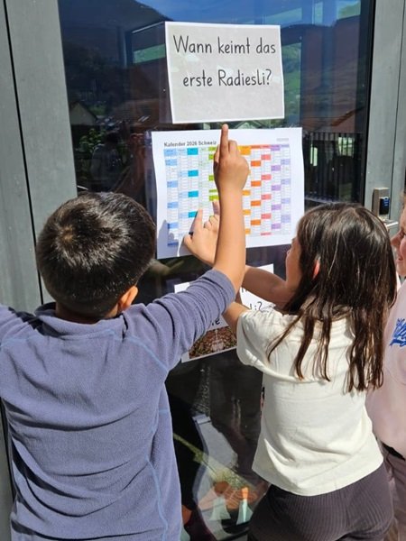 Nach dem Pflanzen durften die Kinder schätzen, wann wohl das erste Radieschen keimt, wie viele Rüebli und Kartoffeln etc. wir ernten. Wir sind schon sehr gespannt, wer Schätzkönigin oder Schätzkönig wird!