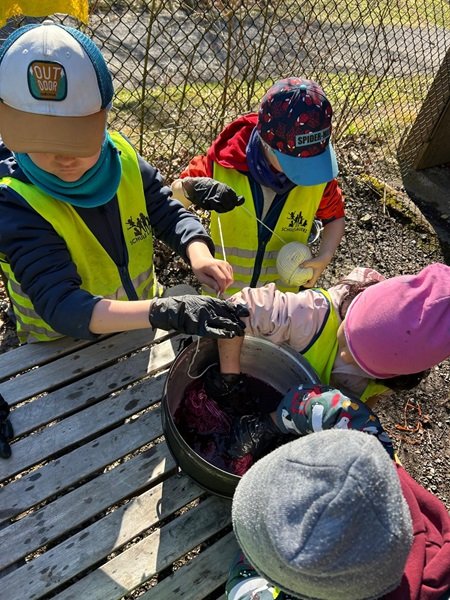 Parallel dazu hält der Frühling auch im kreativen Bereich Einzug. Passend zur Jahreszeit und mit Blick auf Ostern experimentierten die Kinder in der vergangenen Woche mit Naturmaterialien. Aus Wolle versuchten sie, eigene Wollfäden herzustellen. Eine Aufgabe, welche Geschick und Geduld erforderte. Anschliessend wurde es bunt: Mit Rotkraut, Safran und Randen zauberten die Kinder ihre eigenen Farben, um die Wolle einzufärben. Das Ergebnis konnte sich sehen lassen und brachte die Farben des Frühlings direkt ins Klassenzimmer.