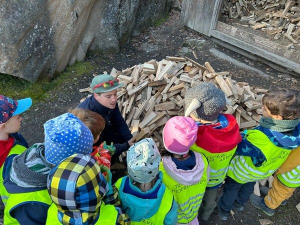 Doch damit nicht genug: Im Tierpark wartet bereits das nächste spannende Projekt. Bis zu den Maiferien dreht sich alles um die verschiedenen Berufsfelder im Tierpark. Wer arbeitet eigentlich dort und welche Aufgaben gehören dazu? Mit tatkräftiger Unterstützung von Pascal aus dem Bereich Unterhalt durften die Kinder selbst aktiv werden und Holz nachfüllen. Auch bei der Fütterung der Kolkraben konnten sie mithelfen und so einen direkten Einblick in den Alltag gewinnen. Die Begeisterung ist gross und die Entdeckungsreise noch lange nicht zu Ende.