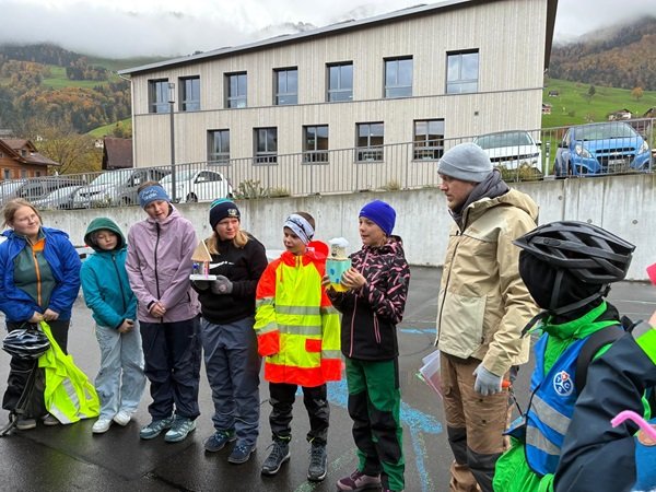 Nach der Znünipause schwang sich die Klasse erneut auf die Fahrräder und umrundete den Lauerzersee. Der Regen hörte rechtzeitig auf, die Sonne zeigte sich – und sogar ein Regenbogen begleitete die Gruppe. Unterwegs gab es neben der schönen Aussicht auch eine spannende Baustelle an der Seestrasse zu bestaunen.