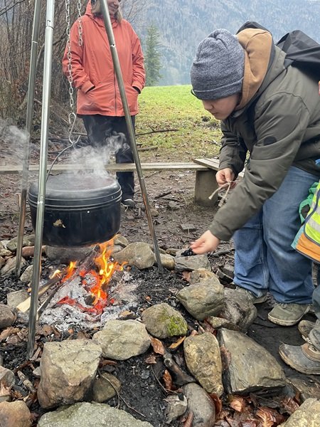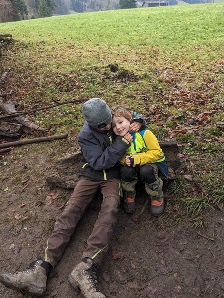 Eine Woche später stand der langersehnte Anlass mit den Gotti- und Götti-Kindern auf dem Programm. Dieser fand im Wald und im Schulhauskindergarten statt. Nach der Begrüssung lief die Hälfte der Kinder in den Auliwald. Dort wurde geschnibbelt, gekocht, gesungen und gespielt, ganz nach dem Motto Sternschnuppesuppe. Ausserdem konnten die Kinder einen Wunsch auf ein Blatt Papier schreiben und ihn ins Feuer werfen, damit er wahr werden konnte.