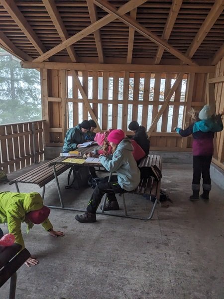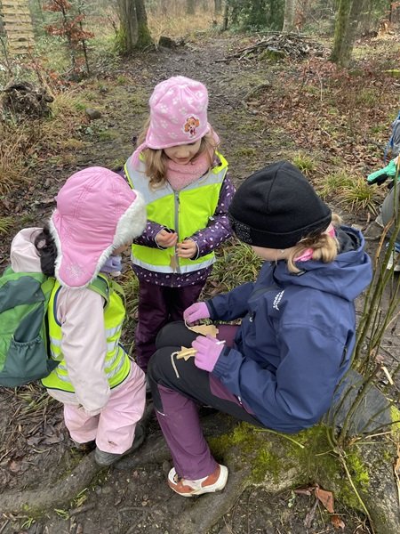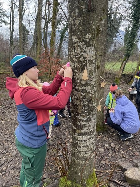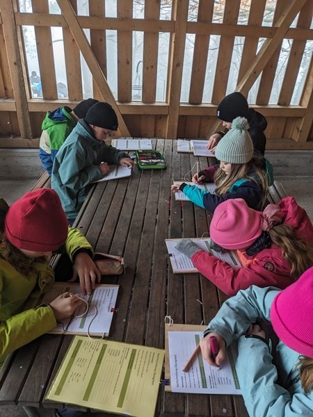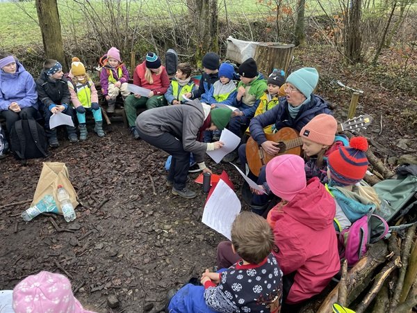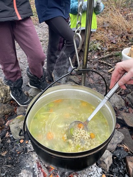 Nach der Adventsgeschichte der «Die Kaminski-Kids»: Der grosse Weihnachtsfall machte sich die Klasse auf den Weg in Richtung Hirschweide. Dort wurde die Basis eingerichtet und ein Feuer gemacht. Anschliessend waren die Schülerinnen und Schüler in drei Gruppen unterwegs. An einem Posten lösten sie eine Übungs-Lernkontrolle zum Thema Rechtschreibung, die mit verschiedenen Bewegungsaufgaben verbunden war. Ein weiterer Schwerpunkt lag auf dem Umwandeln verschiedener Längenmasse. Beim dritten Posten bereiteten sich die Kinder auf den kommenden Anlass mit den Gotti- und Götti-Kindern aus dem Kindergarten vor. Gemeinsam mit Frau Küchler wurde das Lied Sternschnuppesuppe vom Schweizer Liedermacher Linard Bardill eingeübt. In der Znünipause wurde intensiv „15 gilt“ gespielt und zur Aufwärmung gab es Buchstabensuppe.